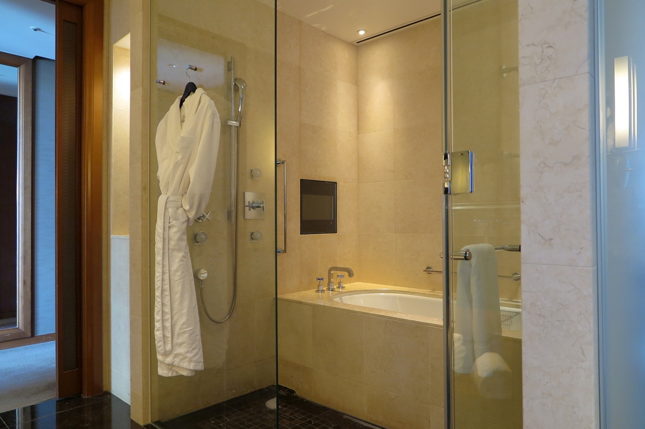 場所は地下鉄三路線が乗り入れる「本町」駅、その真上の建物なので便利この上ありません。1階ウェルカムロビーでは常に複数のスタッフが待機、セキュリティー的にも安心感があります。チェックイン手続きなどは12階のメインロビーで行いますが、その窓の外には枯山水をイメージ庭園も造ってあります。開業10年目を迎えていますが、その館内は重厚で質感が高いため、味が出てきているように感じます。こちらに宿泊したら、やはりテレビを観ながら大きなバスタブで寛ぐ時間が至福の時間になります
