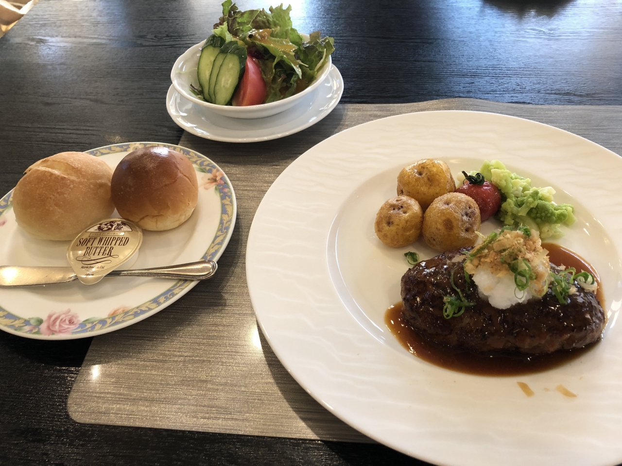 スープ、サラダ、メインのハンバーグ、パン、ドリンクのセットメニューをいただきました。