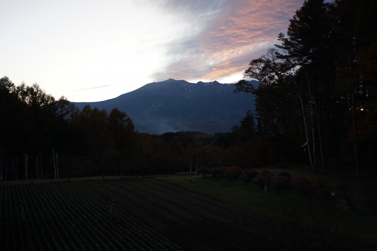 さすがに場所は遠くて都内から片道4~5時間、帰りの渋滞を避けようとすると1泊でも短いくらいです。16:30頃到着、もう夕暮れ時間でしたが、晴れだったのでチェックイン作業したラウンジから見える御嶽山が綺麗でした。あいにく翌朝は曇り雨でしたが。