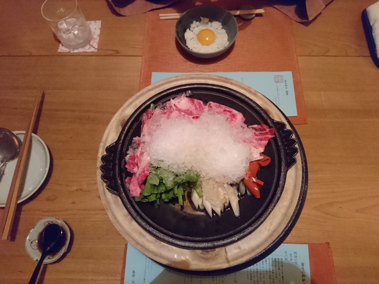 食事は食事処で。夕食は前菜から最後までどれも美味しかったです。氷すき焼きも出てきましたし、寿司を目の前で握ってくれるパフォーマンスも。