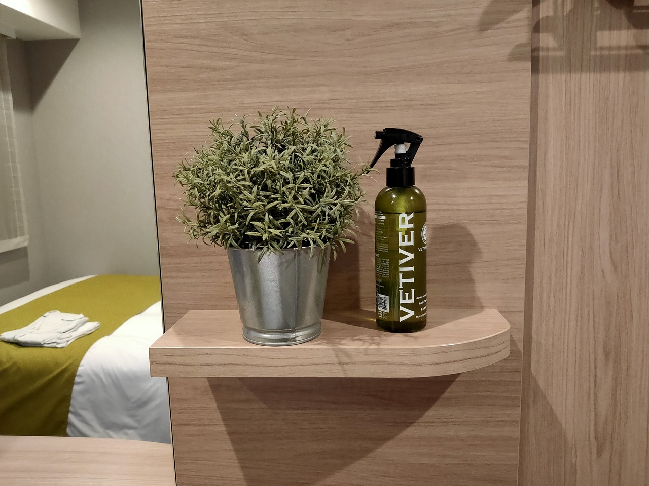 ネスト=巣をイメージしたグリーンがアクセントになっています。小さな観葉植物が疲れた身体に優しいです。