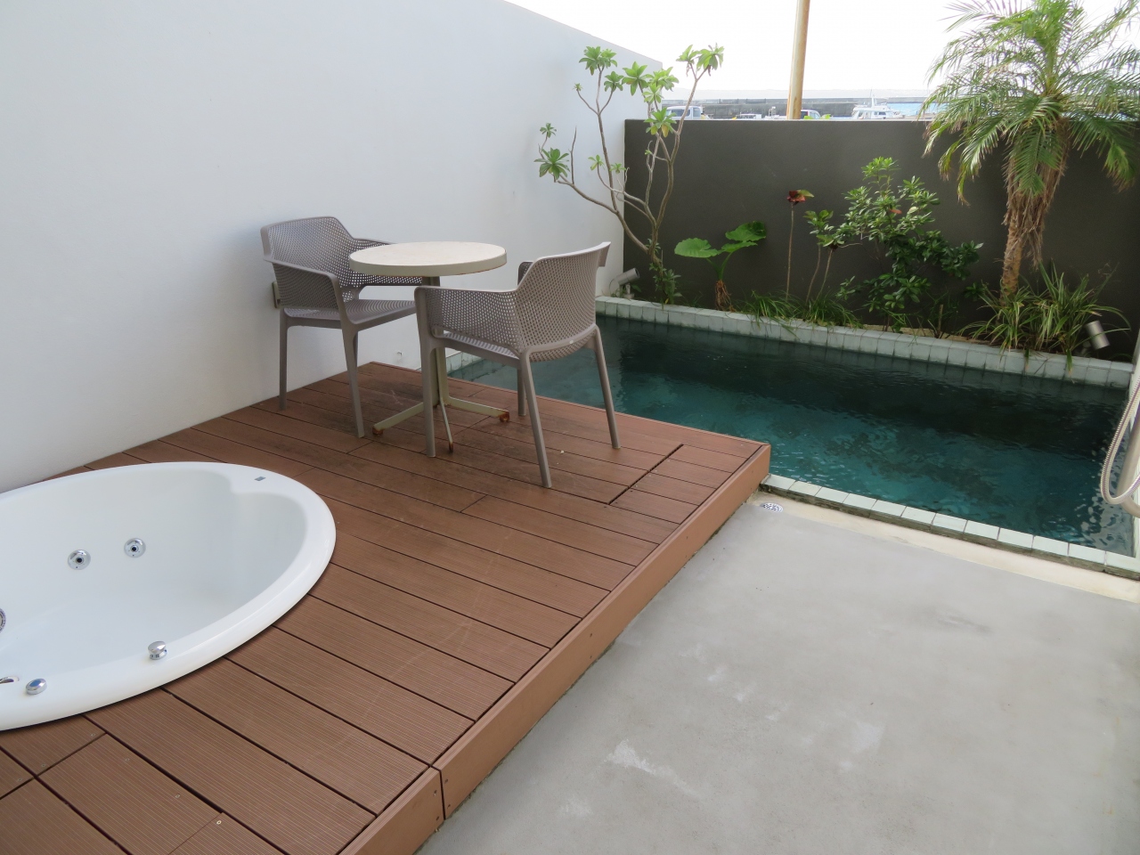 ホテルに2部屋しかないプライベートプール付のお部屋に泊まりました。プールの他、テラスには丸い2人は入れるジャグジー風呂がついていて、リゾート気分が味わえます。