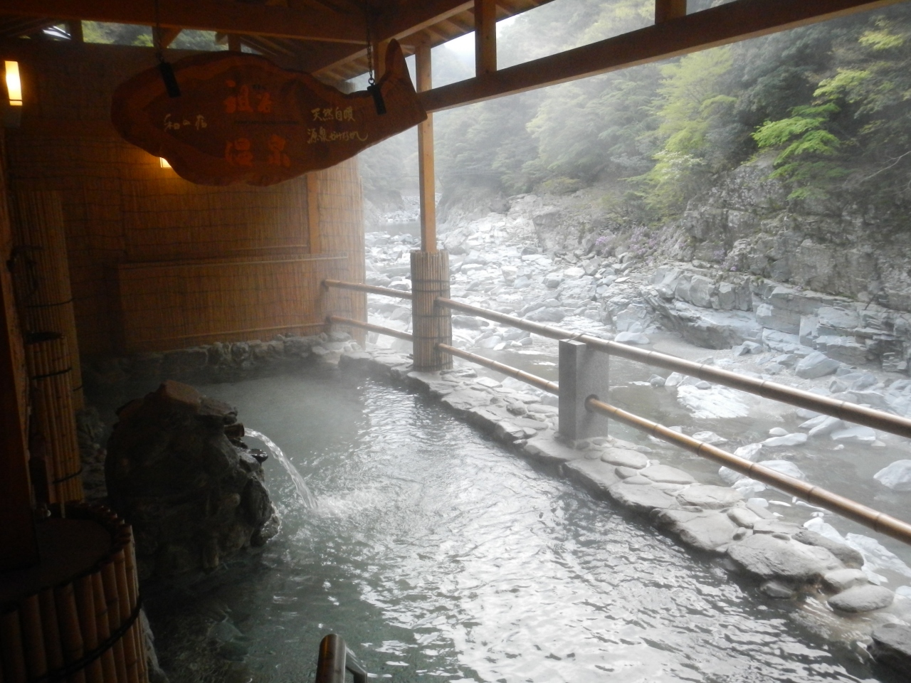 道路際の宿の建物からケーブルカーで170mほど下った谷底に露天風呂があり、美しい渓谷を見ながら湯につかることができます。