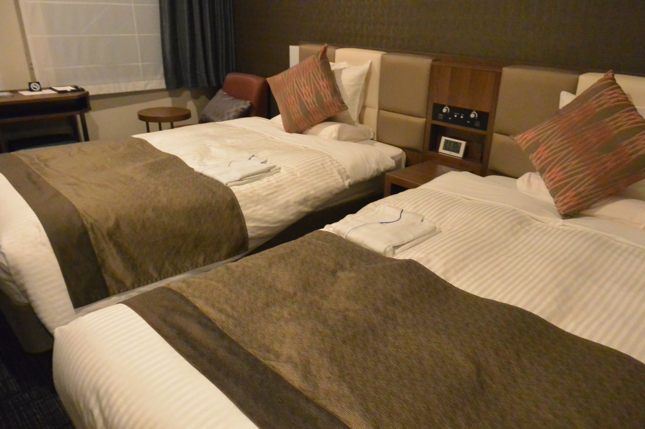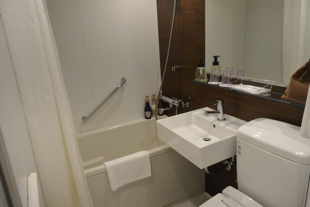 部屋はそれほど広くありませんが、洋服ダンスをなくしてハンガーは壁に直接掛けるなど、工夫がされていて、その分ベッドが広くて気持ちよくすごせました。部屋全体が落ち着いた色調で、清潔でした。アメニティはロビーにまとめておいてあり、必要なものを各自取っていくというスタイル。ユニットバスにしては浴槽も広く、洗面所もおしゃれな感じでした。平日だったのでツイン一泊6900円とコスパがよかったです。