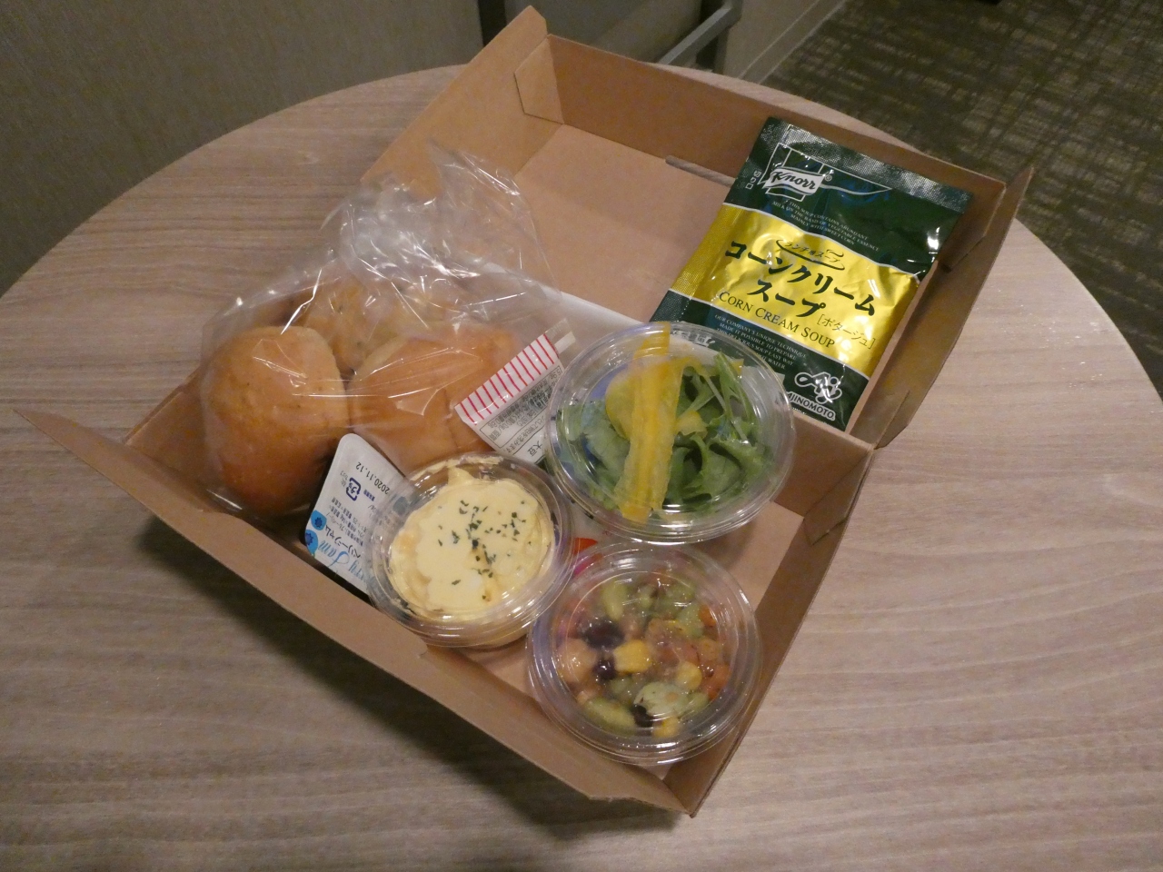 朝にフロントで朝食券と引き換えにパン、サラダ、コーンスープなどのセットをもらい、