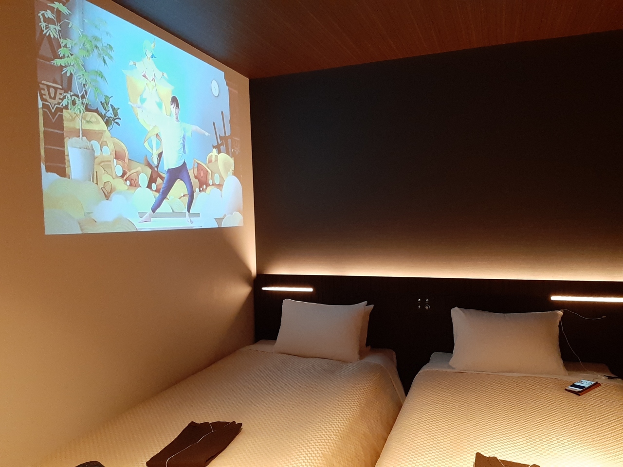 そして、そのプロジェクターが、結構微妙で、ベッドの向きに対して垂直のため、ベッドに横になりながらとかではかなり見づらい。また、イスも2脚あるのですが、そのどちらに座ってもプロジェクターの映像は見づらいという、かなりというか相当に微妙でこれなら素直にTVがあった方が良いと思いました。