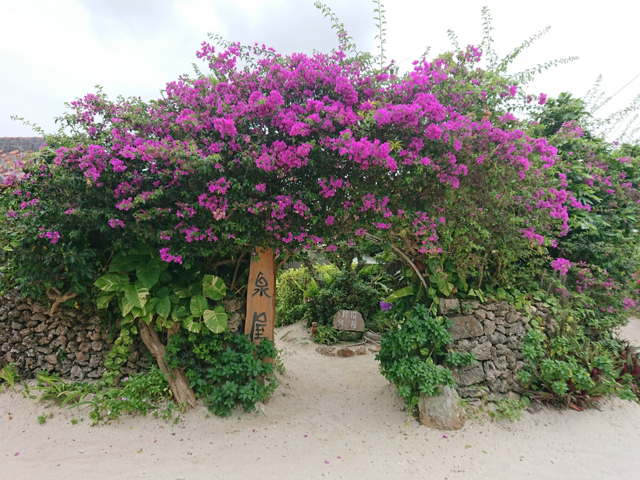 ブーゲンビリアのアーチをくぐって、敷地に入ると広い庭がある。