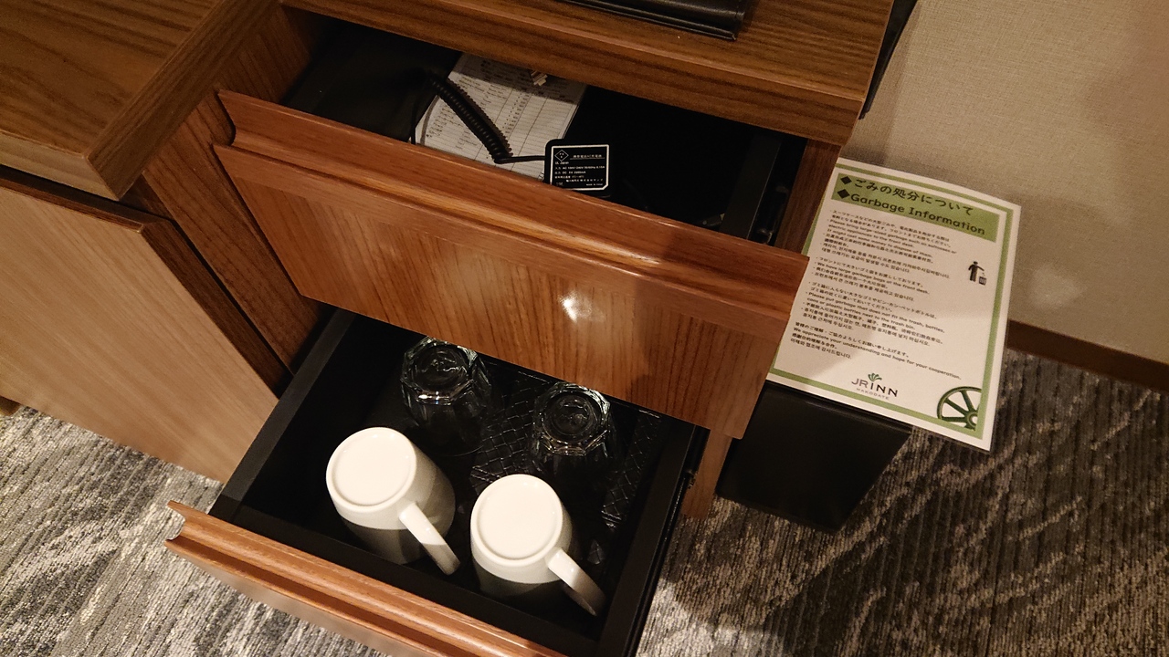 12階建ての最上階に大浴場とラウンジがあります。大浴場からは函館駅のホームが、ラウンジからは函館山を一望できます。フロントからエレベーターへ向かう途中、アメニティ関連が置いてある棚があり、部屋に入る前に好きなものを選んでおくと良いでしょう。