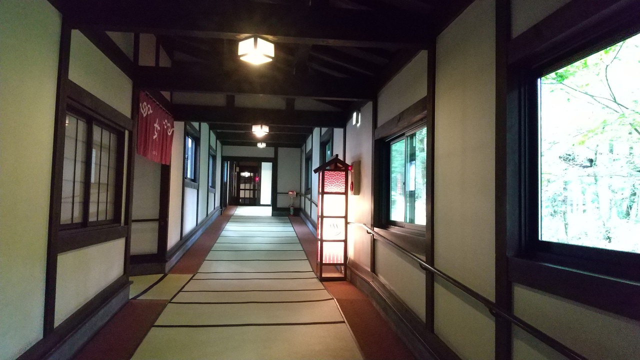 休憩処は合掌造りで広々してゆったり。廊下は畳敷きで素足で気持ち良く、窓から見える景色も緑豊かで目に優しく最高です。