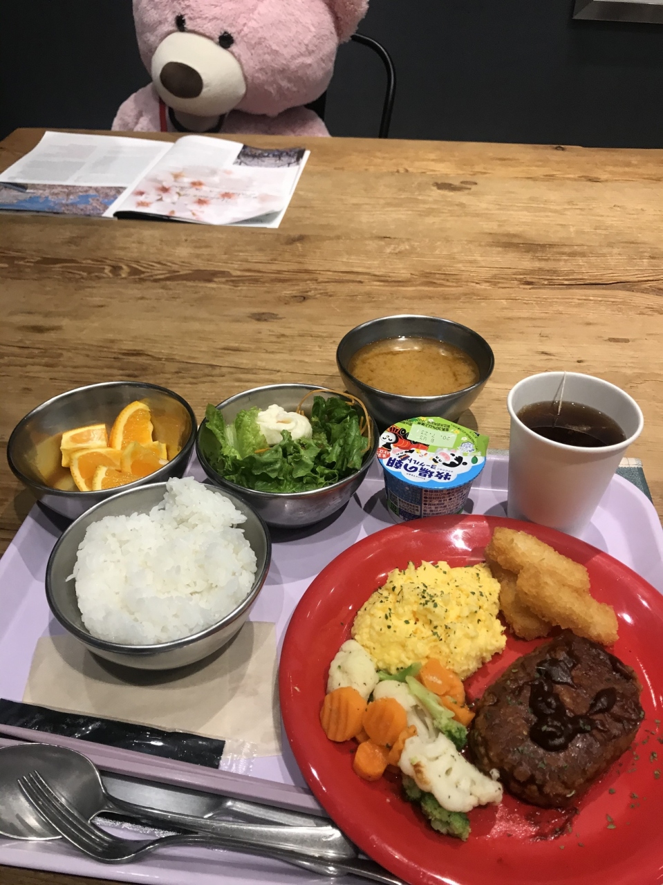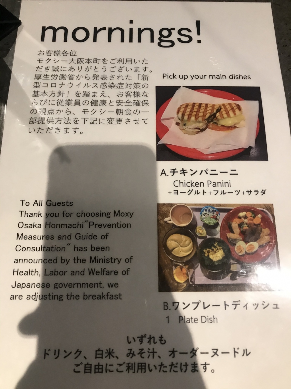 チェックインカウンターにはアクリル板が置かれ、自動アルコール消毒器が設置されてました。このアクリル板にポップなイラストなどが描かれているのがモクシーらしいです。ジムは24時間対応で以前と変わりはありません(アルコール消毒液が置かれるようになってました)。朝食はチキンパニーニか日替わりプレートの選択制で変わりなし。ヌードルバーはトッピングが置かれていませんが、頂くことは利用可能です(うどんorラーメン)。ただし以前にあったワッフルマシンやサラダなどのバフェも全て撤去されていました。日替わりプレートはパンがデフォルトですが、ご飯に変更も可能。お味噌汁のマシンは自由に利用出来ます。ボリュームもしっかりあるので、問題ありませんでした。