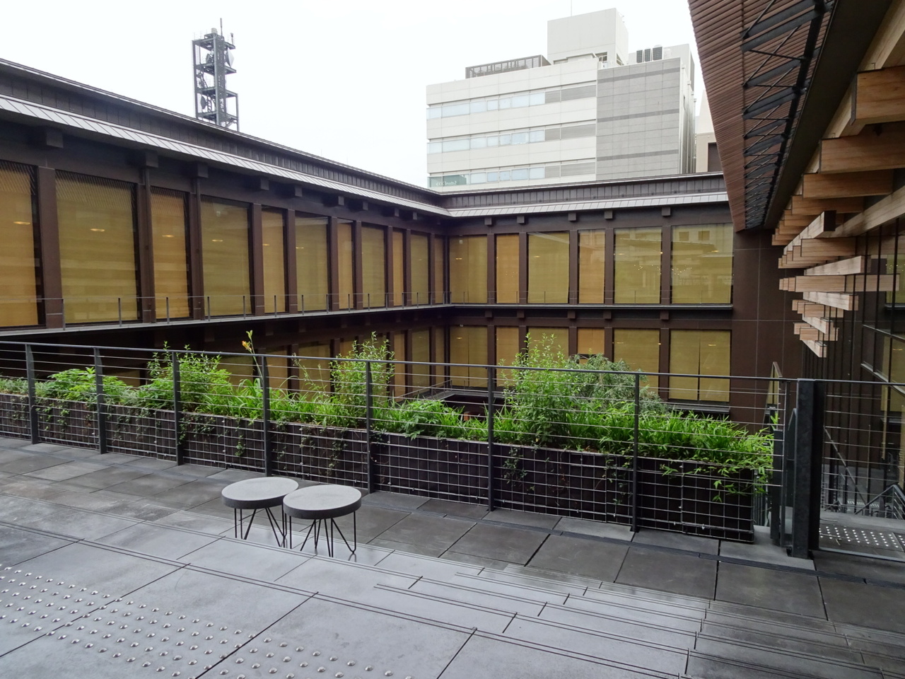 隈研吾の木の建物と新風館の中庭の緑もあり、素敵なホテル。