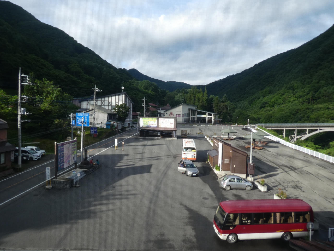 泊まった部屋からバス停が見えました。時刻通りのバスに乗れなかった人が、後から次々来るミニバンタクシーに振り分けられていく様子もわかります。車も置かせてもらえたので、尾瀬ハイクへのアクセスと安心感は最高と言えます。宿は昭和の造りで、館内はやや暗めでしたが、スタッフの皆さんは明るくキビキビと動いていました。部屋は内装をきれいにしてありますが、畳はかなりくたびれた感じ。お風呂は内風呂しかありませんが、とろみと若干の硫黄臭のあるお湯で、緑を眺めながら気持ちいい入浴ができます。ただし、男湯の脱衣所が外から丸見えなのってどうなんでしょう。食事はおいしくいただきました。