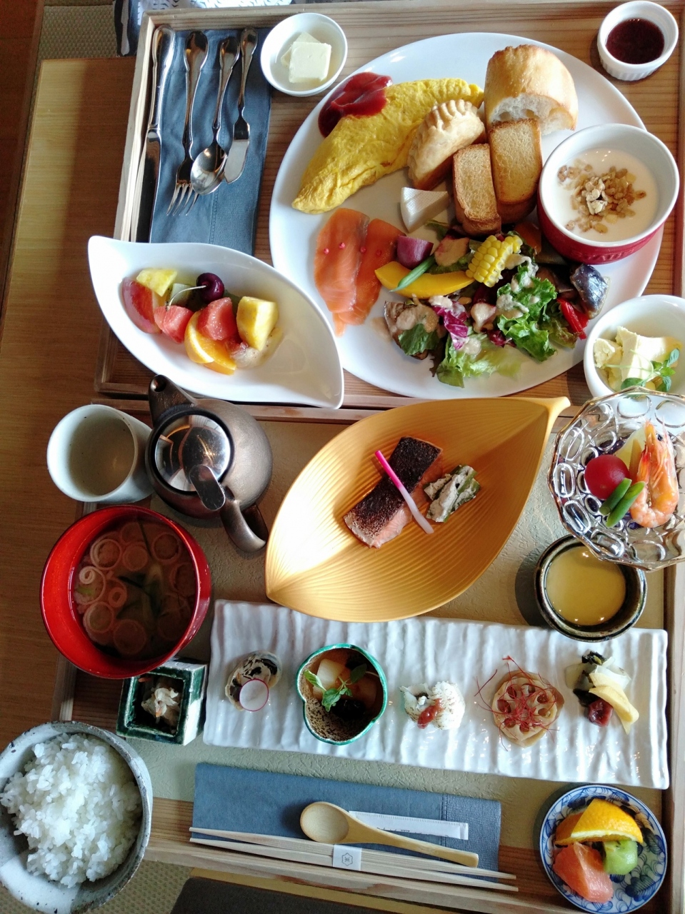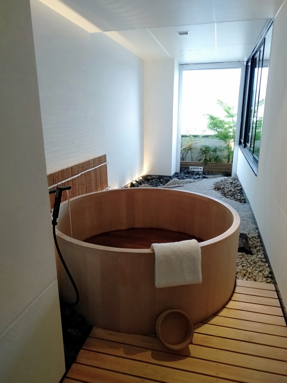 東本願寺の隣、新しく隅々まで清潔感が感じられ、木を基調に現代的なデザインが感じられます。外風呂も付いた部屋でしたが、隣のビルが近いのが少しネック。ですが、内装は素晴らしく、ベッドはハリウッドツインタイプで、一台で広々。うなぎの寝床のように奥行があります。朝食は併設のレストランが使えずインルームでしたが、和洋どちらもボリュームたっぷりて美味しかったです。