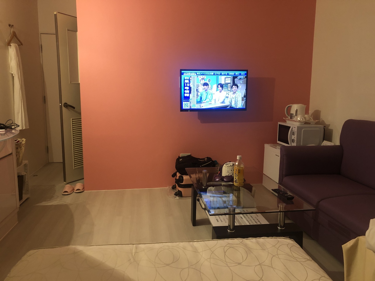 コンセントの位置がテレビ下と洗面台にしかなくて不便でした。長~い延長コードを置いて欲しい。