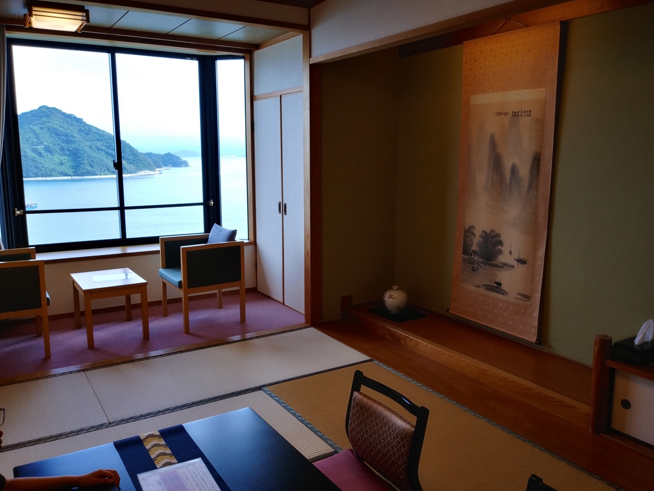 海水浴のため来島し、宿泊しました。丘の上にあるホテルで、たぶん送迎バスもあるのだと思いますが、私は車で。ホテルの正面には4台程度の駐車場で、手前にたくさん駐車場がありました。今回はコロナ対策として、まず検温から。ちなみに水着でも入館はお断りです。お風呂は露天が二つと室内に一つ。部屋は海に面した和室でしたが、きれいに清掃されていました。夕食は会場で食べましたが、少しずつ出てくるタイプで、私には量が多かったです。朝食はバイキングで、今は手袋着用して取るパターンでした。子供の浴衣もあり、質問にもしっかり対応される、親切なスタッフばかりでした。