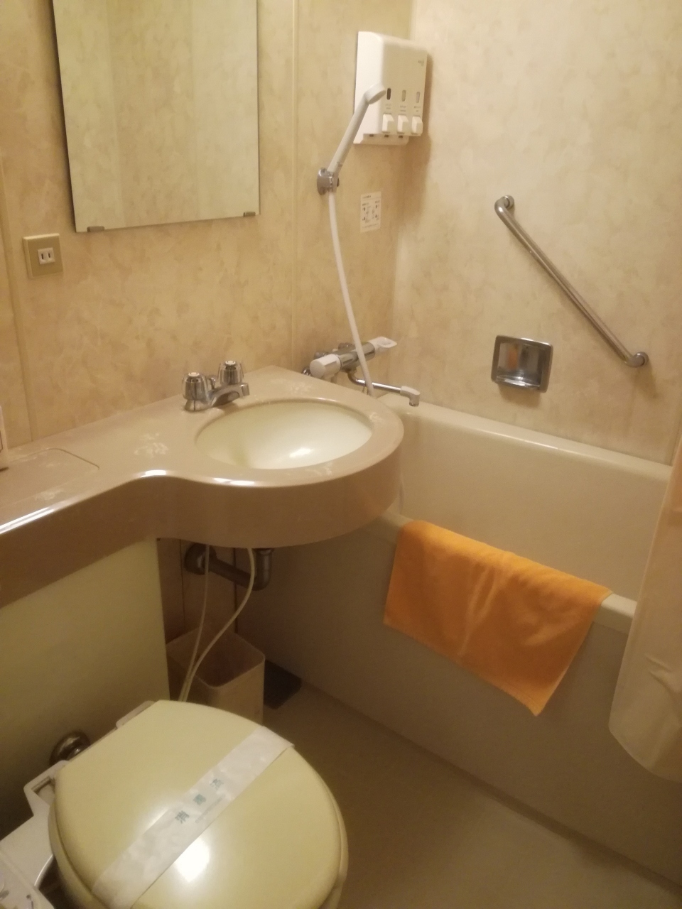 バスルームのユニットバスは一般的なビジネスホテルよりは少し広め。シャワーの湯量・湯温、バスの排水は問題なし。