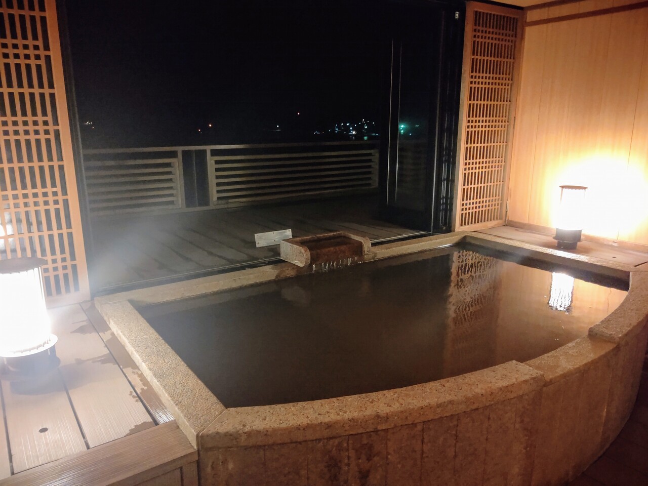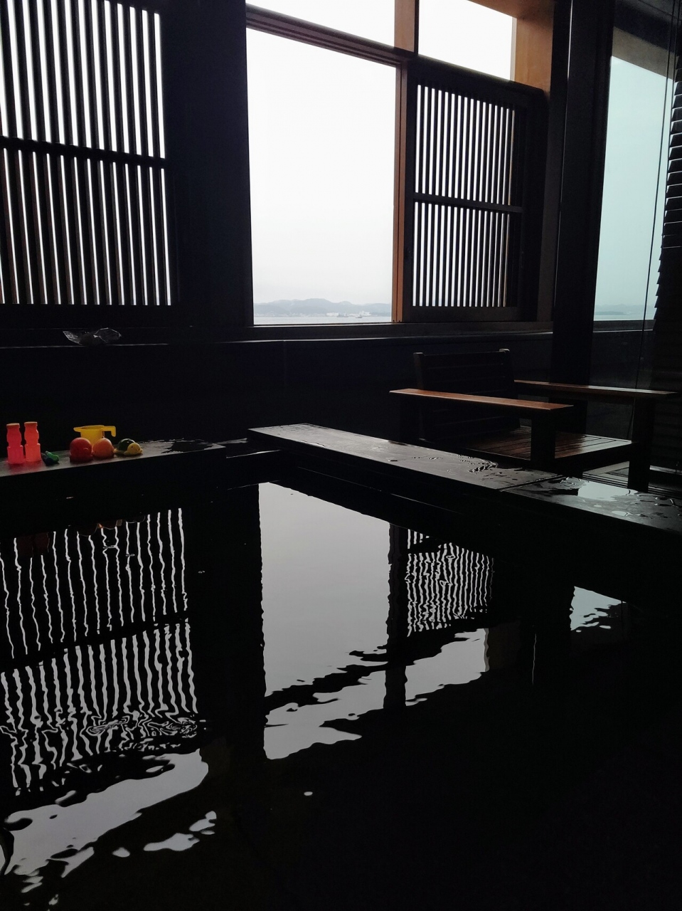 部屋は十分な広さで露天風呂から少し遠いですが海が見えます。