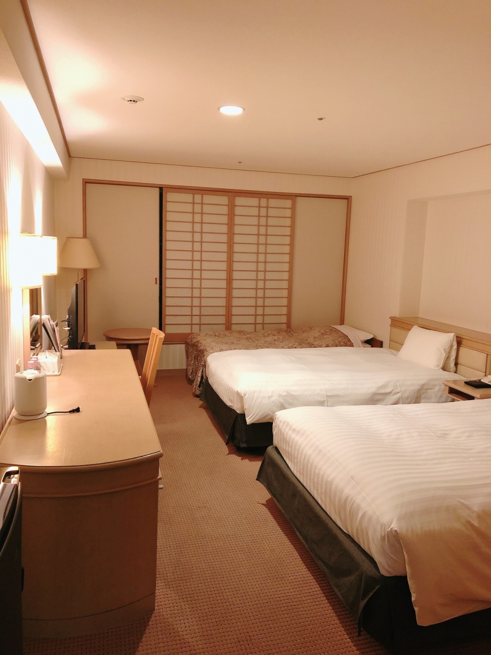 トリプルベット指定での利用です。部屋は十分な広さが確保されています。収納兼デスクも大きい、鏡台もありドライアーを使うにも便利でした。水は人数分、湯沸かしポット、コーヒー紅茶もあります。素泊まりですが近くに飲食店も多いのでご当地グルメが楽しめました。