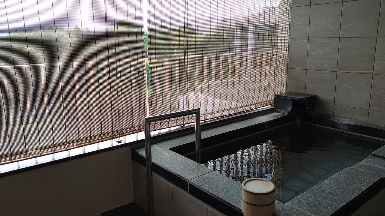 ベランダの温泉は非常に快適で、簾が視線対策にも虫対策にもなっています。巻き上げることもできます。