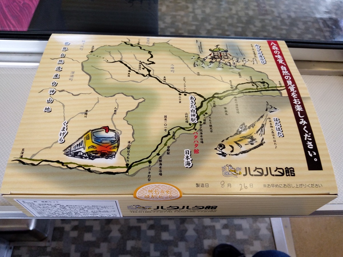 美しい海岸線沿いをはしるJR五能線。この路線を通して「リゾートしらかみ」が走っている。その車内でハタハタ館のお弁当「晩酌セット」を入手することができるのだ。前日までにハタハタ館へ連絡をしてリゾートしらかみの何号、そして乗車する号車番号を伝えておくとホームまでデリバリーしてくれる(停車時間は短いのでお釣りが無いように準備する必要あり)。