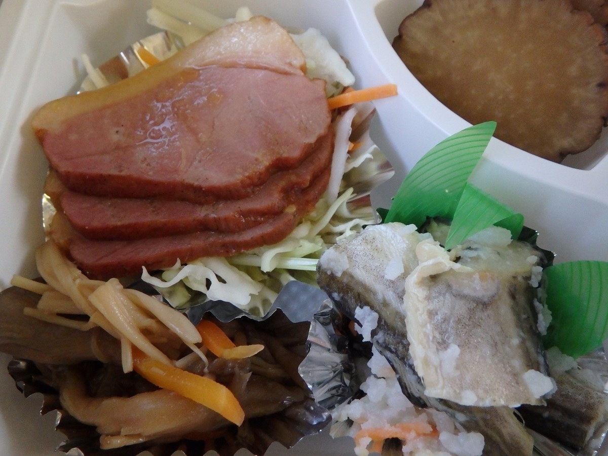 お弁当を開けるとハタハタ一夜干しに飯寿司、鴨のローストなど目移りするような美味しい肴がたくさん。そして一番の特徴は地酒の喜久水のワンカップが付いているということ!(飲めない人はご飯に交換してもらうことも可能)。