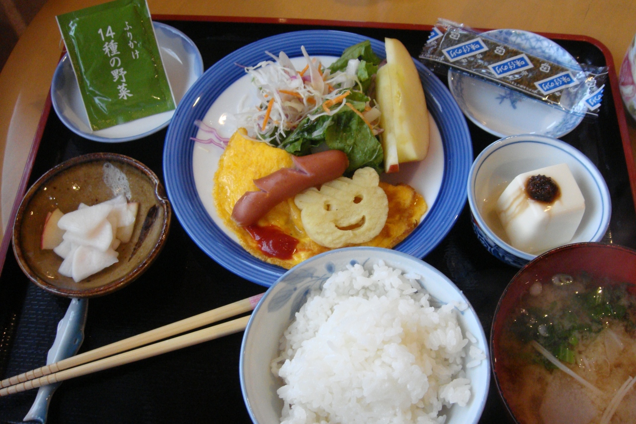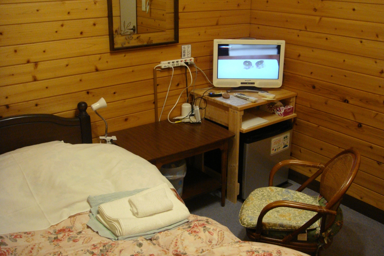 民宿風の旅館。部屋は狭くても、壁が板張りなので、ぬくもりが感じられる。手作りと思われるテレビ台もいい雰囲気を出している。洗面台とお風呂は共用。二か所あるお風呂は時間が限られていて、およそ30分で入浴。家族で利用できる、いわゆる家族風呂にも。玄関前には雪囲いがしてあるので、これから冬に向かって積雪が多いと思われる。廊下には宿泊したちびっ子たちの絵などが所狭しと飾られていて、この宿への愛着がいっぱい。朝食は、地元の食材も使われていて、オムレツの上にはかわいくカットされたクマさんが。お子さんがいたら喜びそう。