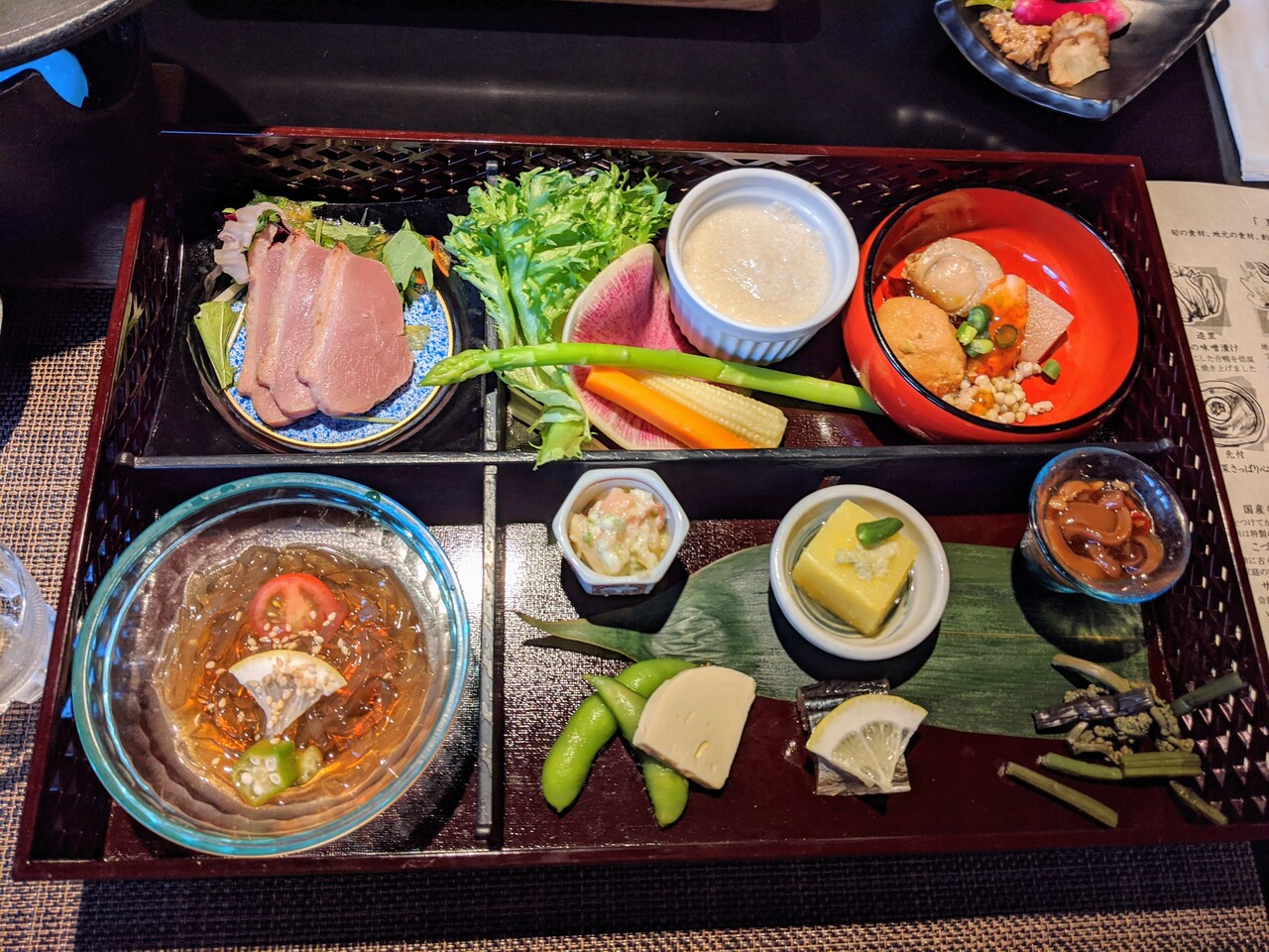 夕飯は自分たちのペースに合わせて提供してくれ、地酒の種類も豊富。また、料理が小盛りで複数種類出るためお酒のあてに最高!