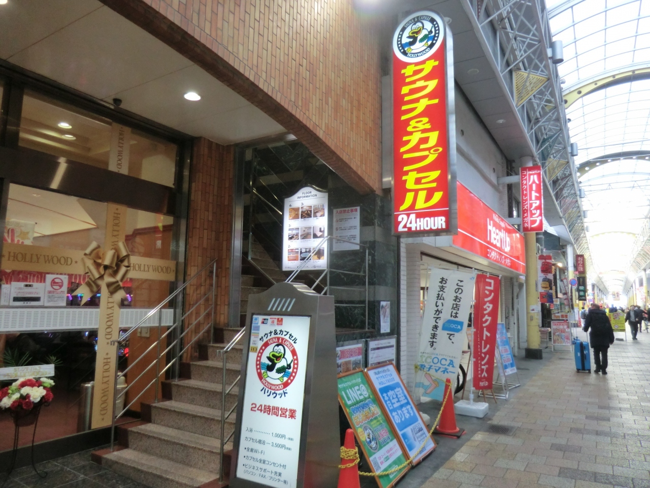 岡山駅前の商店街に入ったすぐ左側のパチンコ店の上にサウナ&カプセル'ハリヴッド'はあります。