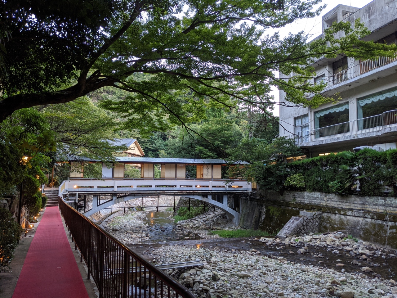 游月山荘はフロント棟と客室棟が川で隔たれており、月光橋という渡り廊下で繋がっていて、この渡り廊下がとても風情があります。