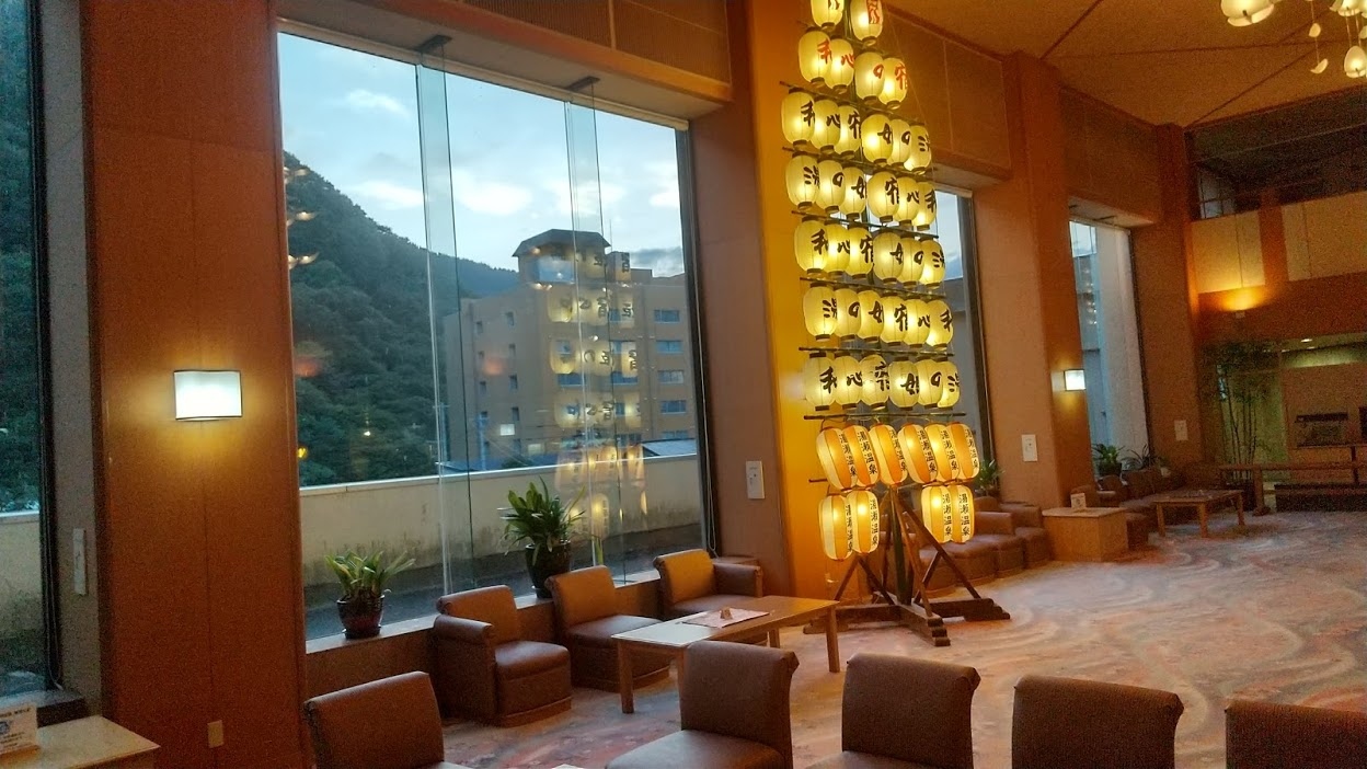 人里離れた山の中の湯瀬温泉には大きなホテルが2件と小さな宿が少しあるだけの場所です。姫の湯は、駅からすぐの場所にあります。3棟からなる大型ホテルで宴会設備が充実、風呂は広く露天風呂もあり、シーズンなら観光バスがたくさん来るようですが、平日でバスは2台しか来てなかったので、閑散としていました。