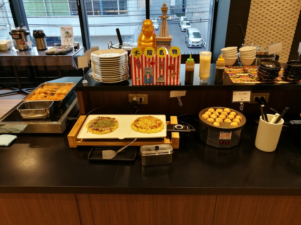 朝食は、6:30から。6:30に行ってもガラガラで、正面に回るたこ焼き器がありました。保温プレートの中でたこ焼きがくるくる回っています。大阪名物のコーナーもあり、お好み焼き、くつかつ等がきちんとあります。それ以外にも種類は多く、スタッフも笑顔できもちのいいサービスです。シティホテルの朝食という感じです。