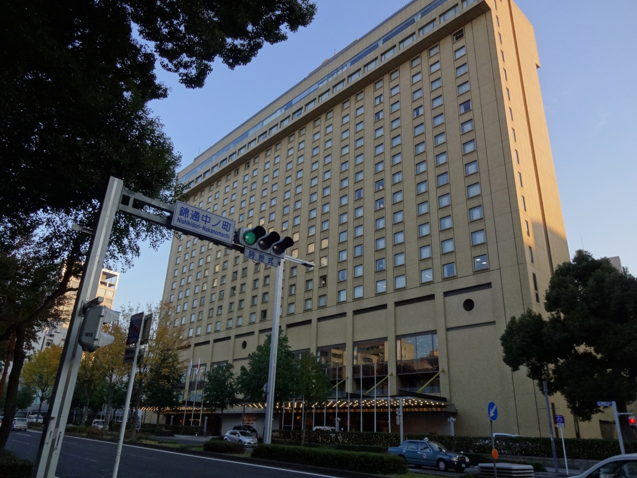 名古屋駅と栄の中間にある伏見駅(地下鉄東山線)下車8番出口から徒歩2分、重厚感のある老舗ホテルに到着。建物はちょっと古く経年劣化も否めない。上層階の部屋を案内され、そんなに広くはなかったが、落ち着いた色合いで、通りには面していたが、静かだった。また、アメニティがブルガリというのは奥方には良かったみたいだ。