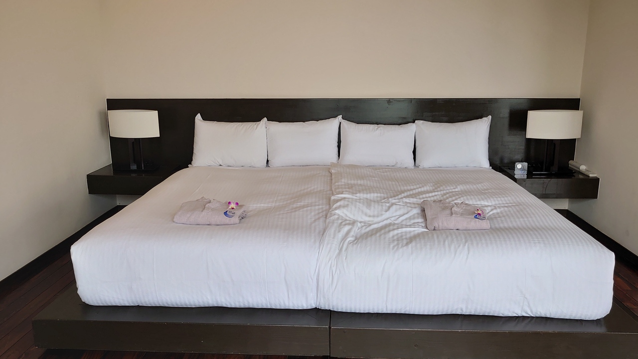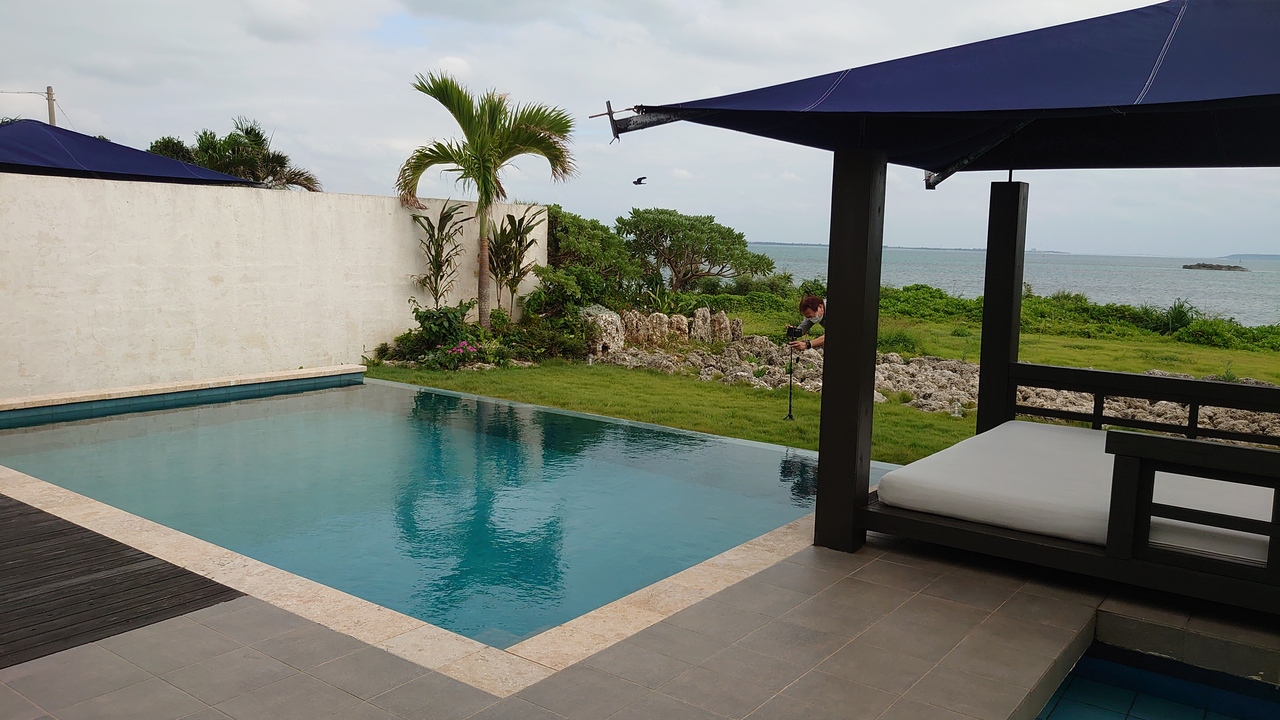 広々したお部屋は白とブラウンの色調で落ち着いた雰囲気ですし、テラスには6×4mのプライベートプールと大きな東屋があって、そこのデイベッドで寝転んでのんびりし、爽やかな風を感じられてとても心地よかった。