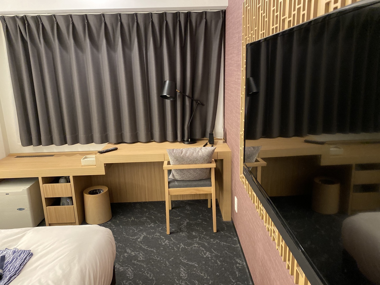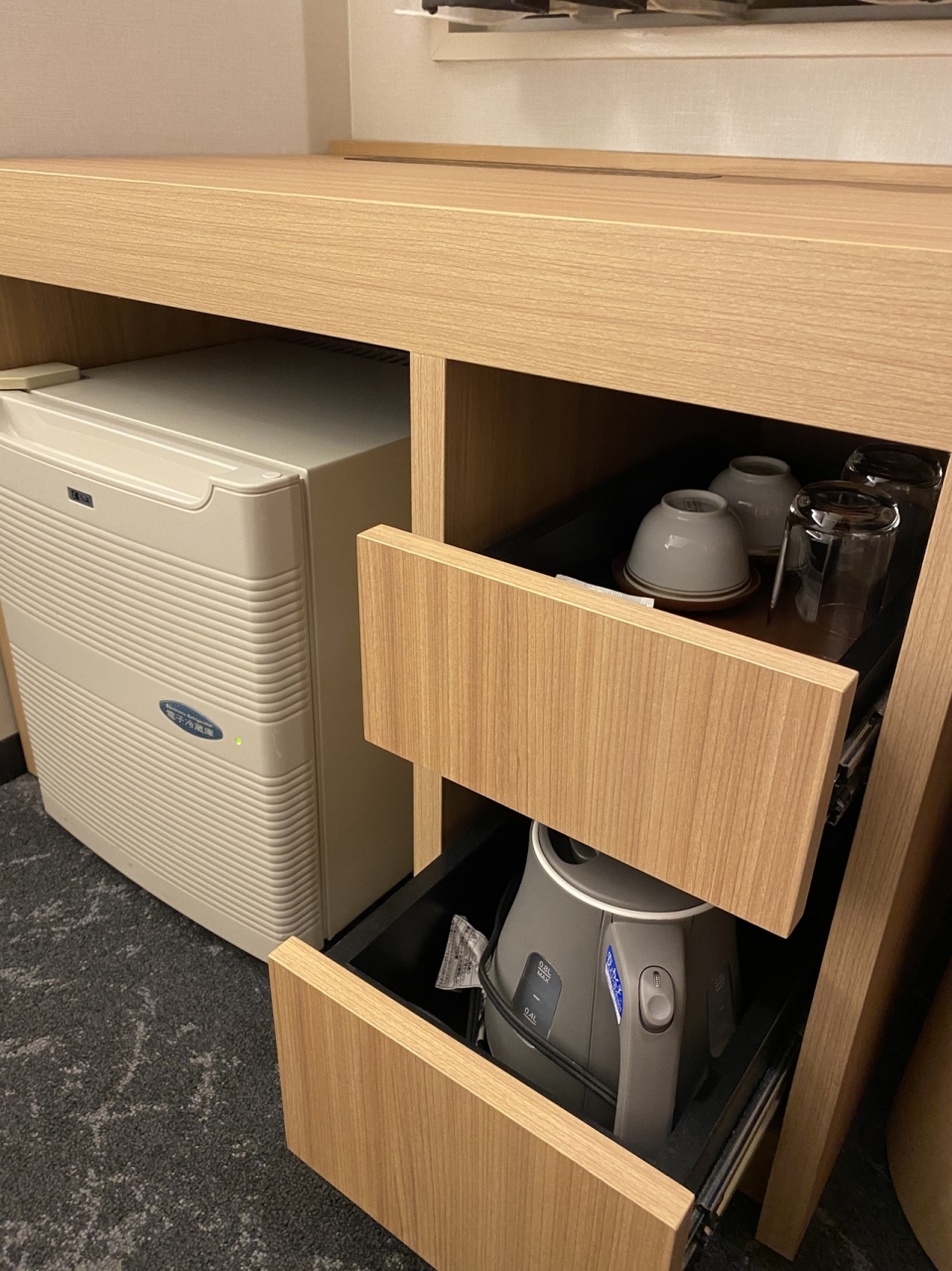冷蔵庫あり、ポットあり、般的なビジネスホテルとは変わりない。