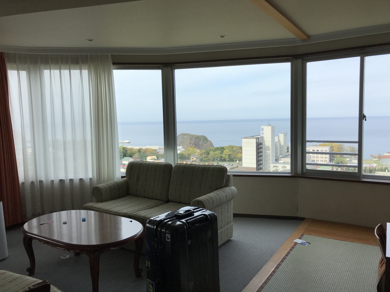 ツインの角部屋というので、ちょっと広めかなと思っていましたが、とっても広くて大満足。7階で2面が窓のオーシャンビュー、背後の山も少し見えました。ソファーセットとデスク、和室付きで最近の宿ではベスト1です。貧乏旅行が多いので。バルコニーがあれば星の写真も撮れたから申し分なかったのになー。