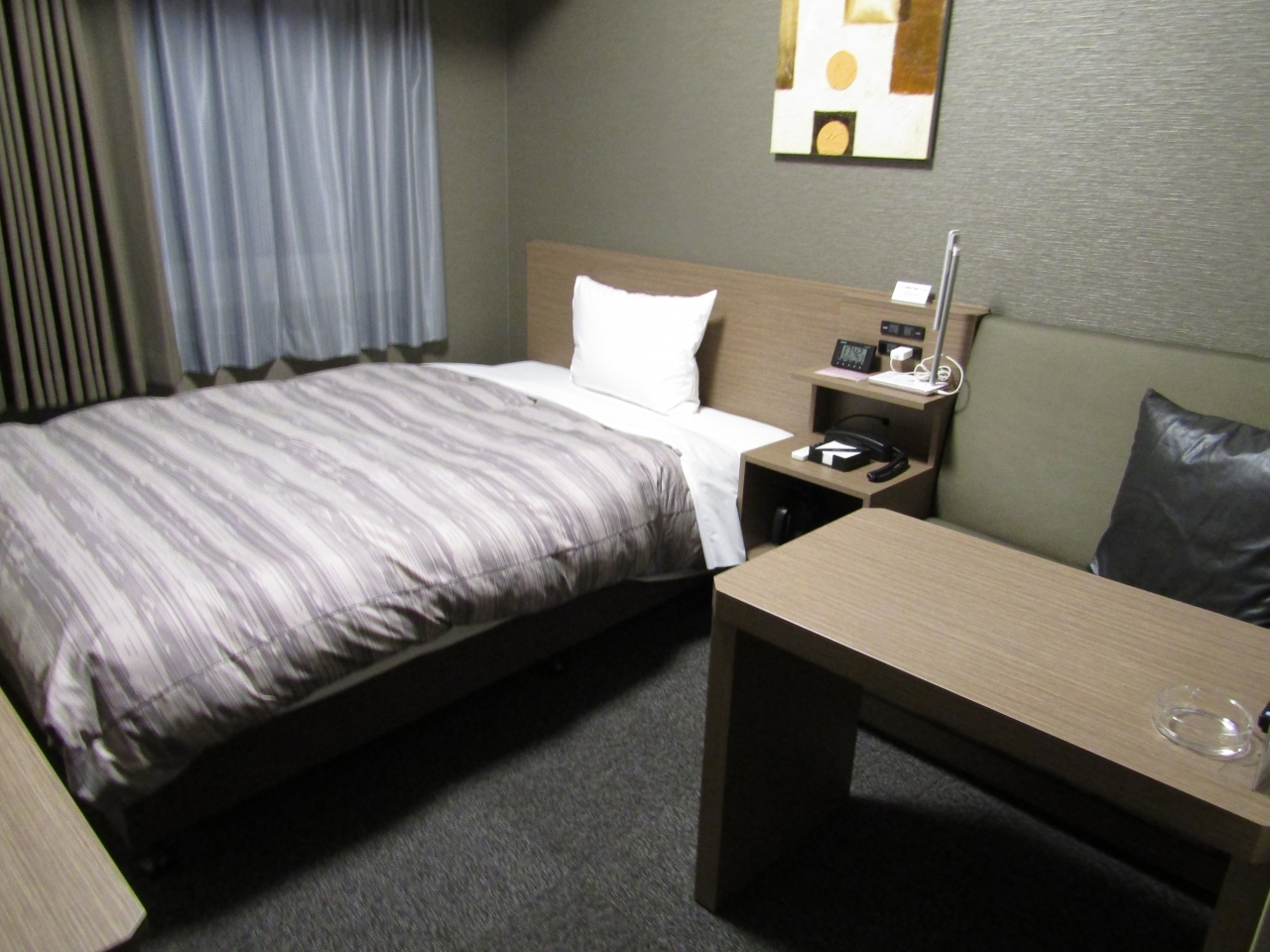 ホテルはまだ新しく、無料コーヒーや大浴場などルートイン品質は期待通りだったが、部屋が線路側のため踏切の警報音がやや気になった。