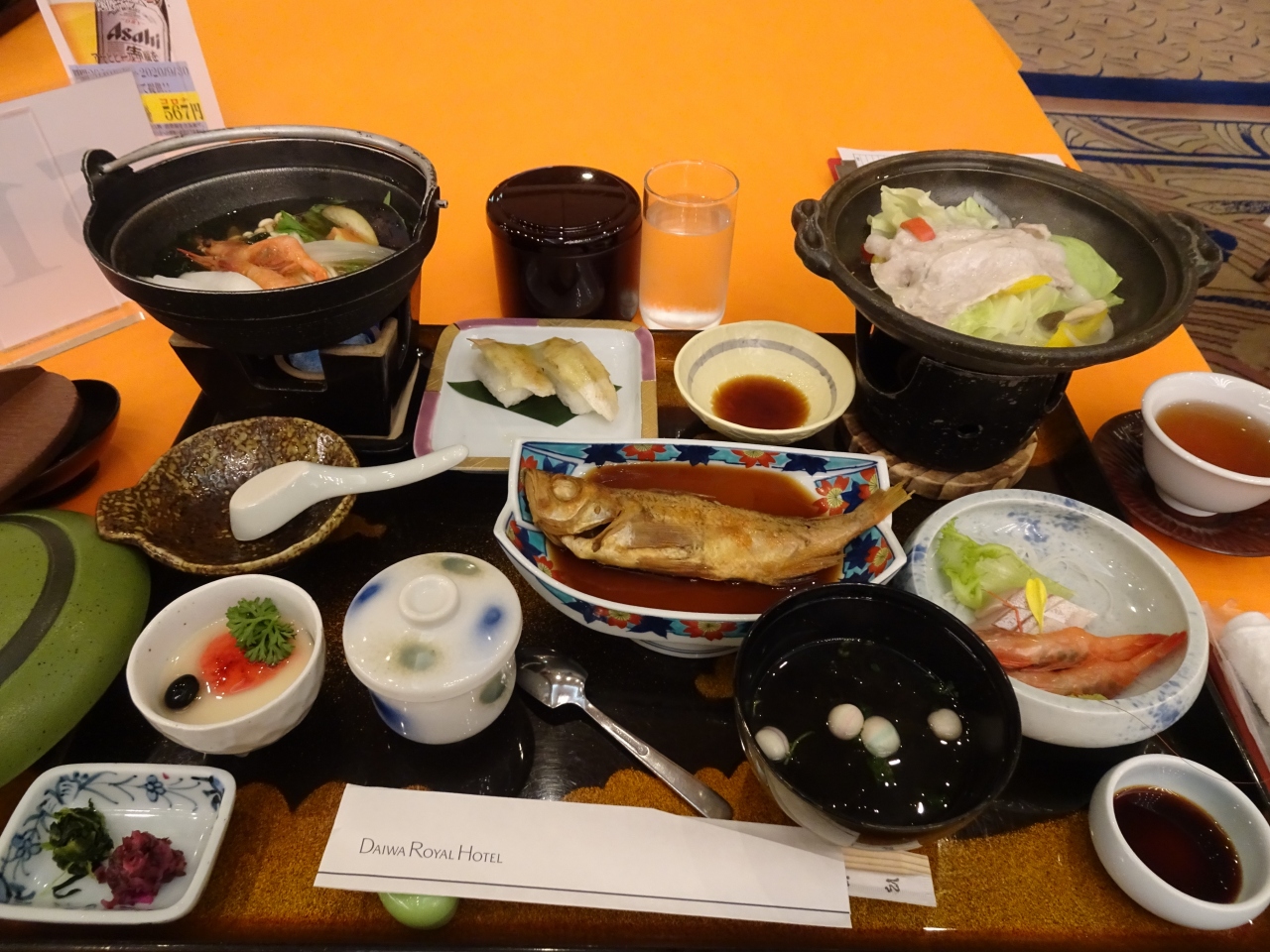 大浴場には露天風呂もあり、夕食は のどくろ寿司をはじめ、煮魚、常磐焼き、お刺身、天ぷらと、海の幸をふんだんに使ったお料理で、とても美味しく大満足♪