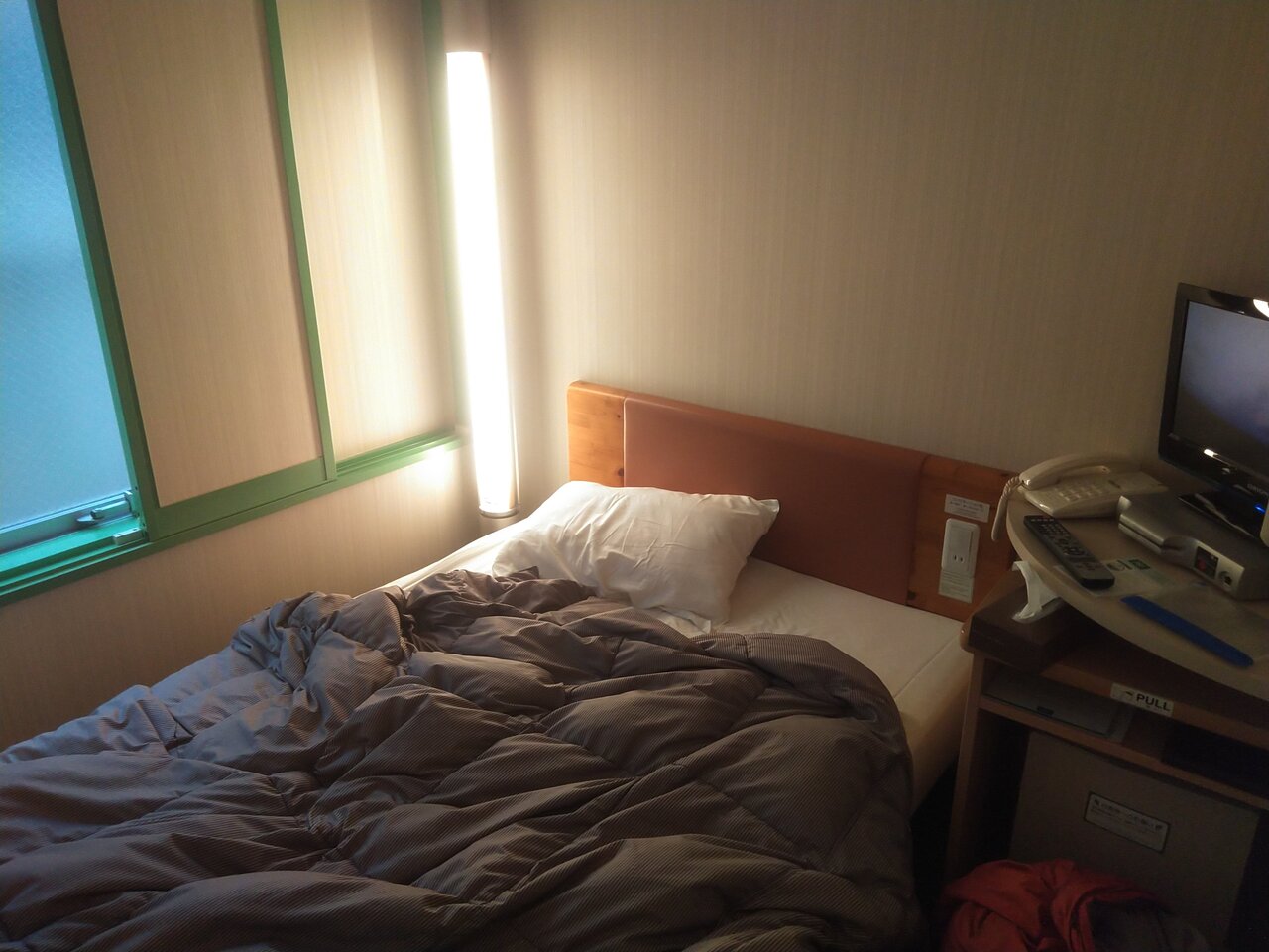 部屋はビジネスホテルとしてはまずまずのベッドサイズですが、料金を考えれば文句の一つも出やしません。