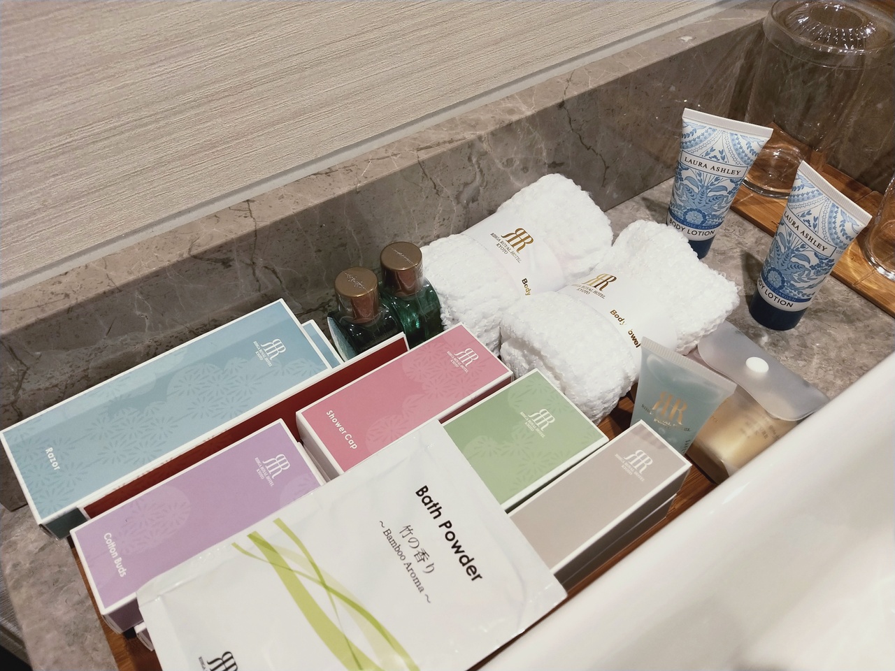 パジャマとバスローブが用意され、アメニティはLaura Ashley。女性に嬉しいアメニティでした。