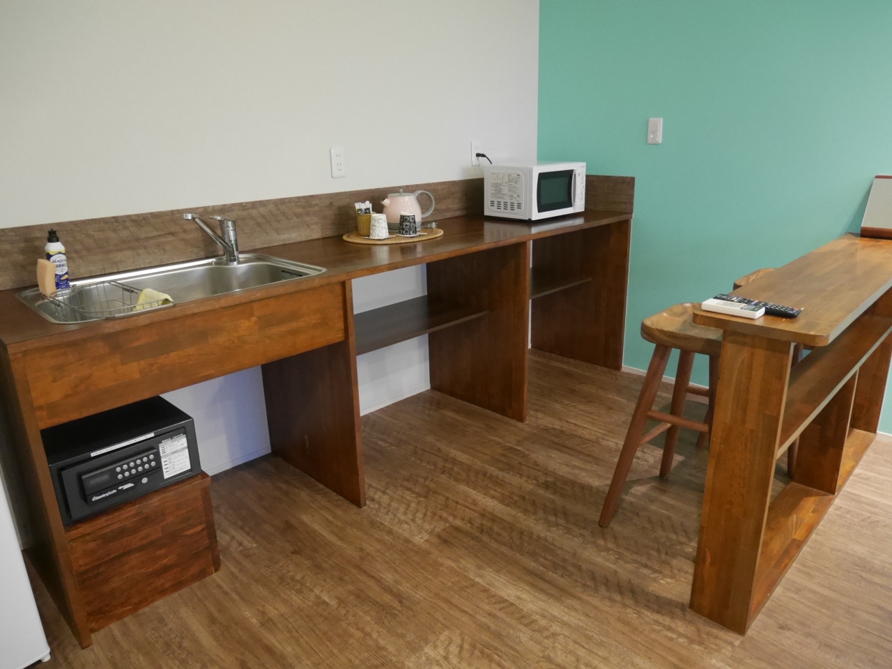 部屋は広くてキッチン付き。トイレとシャワールームはそれぞれ別になっていて、ゆったりとした洗面所に繋がっています。