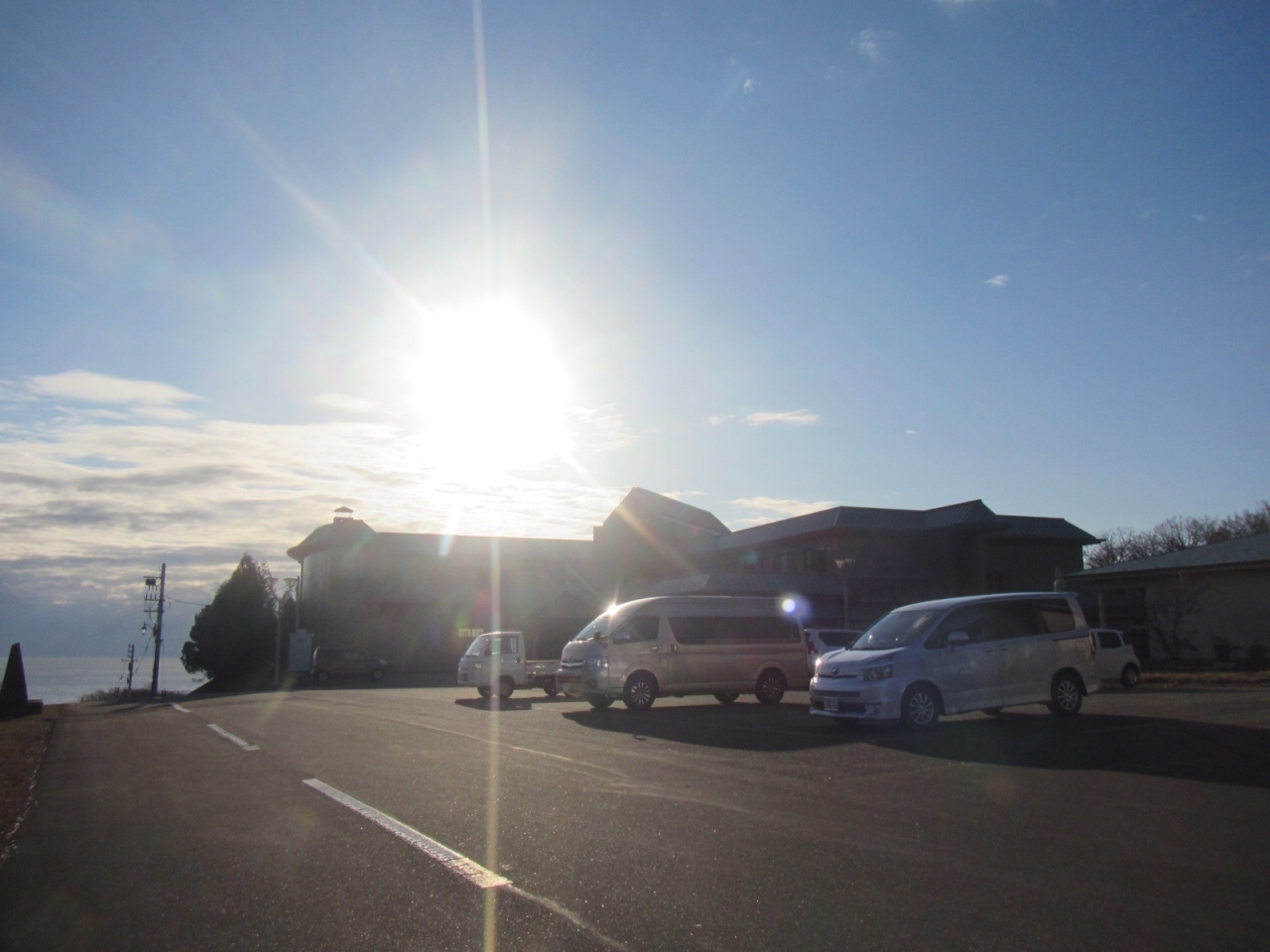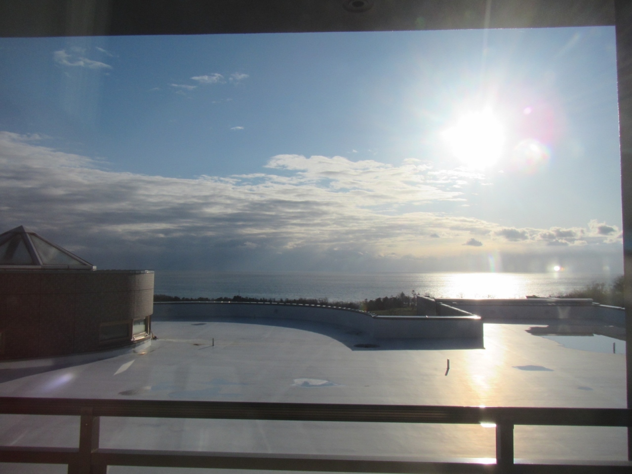 窓からの景色の下部がやや大浴場の屋根で隠れていますが、海が見えて気分が良く、明るい西日が差し込んでいました。