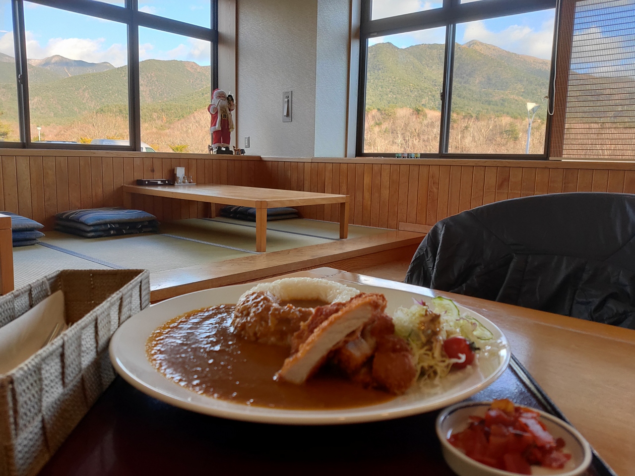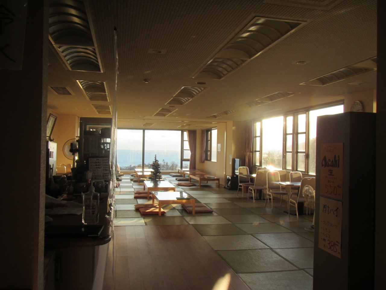 付属のレストランとは別に風呂上りにお座敷の休憩所があり、フランクフルトやカレーなどの軽食をいただけて、海側の場所に席を取ると、男湯と同じように遠くに海を見ながらの食事を楽しめます。