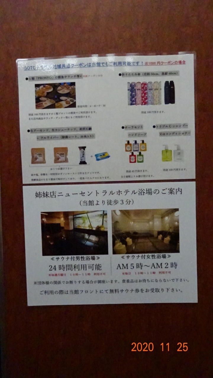 ホテルのお風呂はビジネスホテル特有の狭さですが、徒歩数分ほどの姉妹店の「ニューセントラルホテル」のサウナ付き大浴場が無料で使えます。