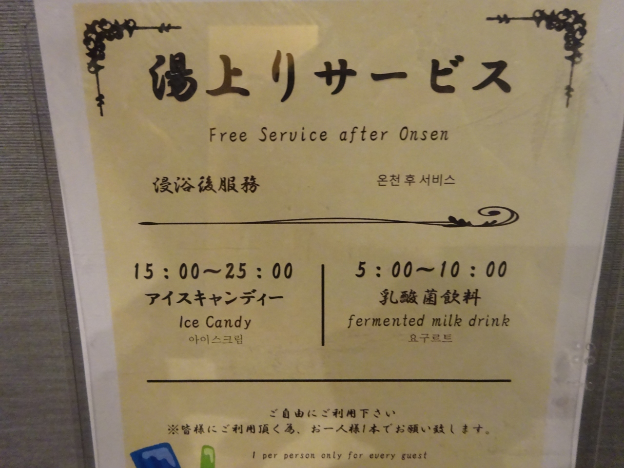 湯上がりサービスとして、生ビールがいただけるのですが、宮崎の焼酎もあります。
