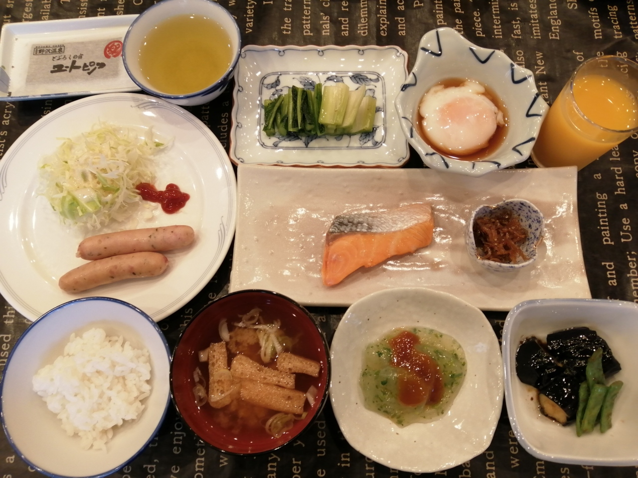 夕食には牛肉の陶板焼き・馬刺し・ヒラメのムニエル・野菜の天ぷら・サバ缶のみそ汁などが出ておいしかったです。