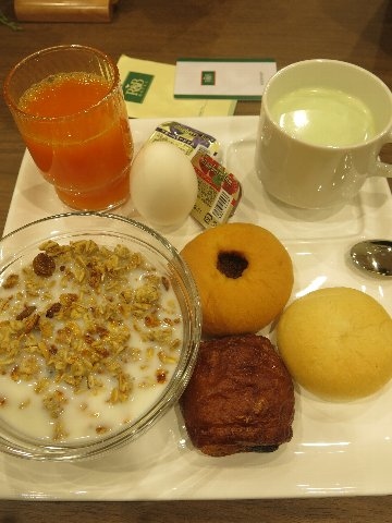 あとは無料の朝食で提供される焼き立てパン。開始時間の6時半には、あつあつのものがいただけました。種類も多く美味でした。