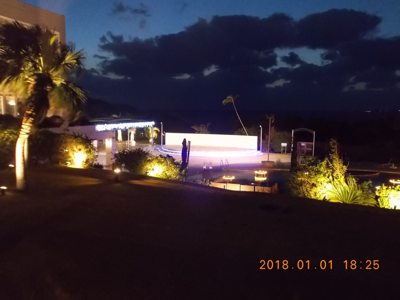 芝生の庭の先の茂みの向こうに伊江島が見え、非常に景色が良い。ホテルからはエメラルドビーチに直接行ける門もあり、9時から17時まで解放されている。14時にチェックインをした後、15時半ぐらいからエメラルドビーチに行ってみた。徒歩3分ということであったが、坂がつづら折りになっていたので5分以上はかかった。朝食は1/2ということもありお雑煮やお屠蘇も振舞われた。1/4は、お雑煮やお屠蘇はなかった。