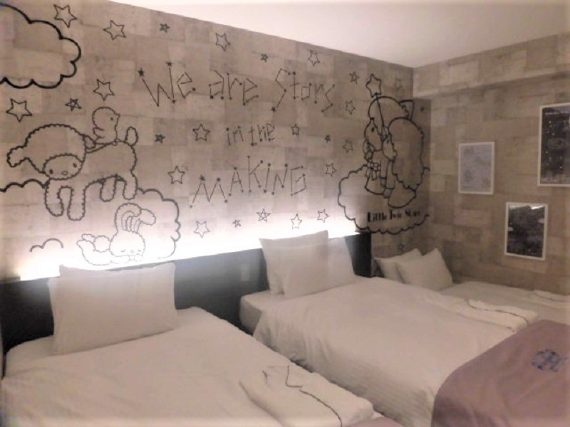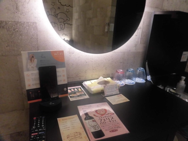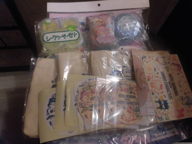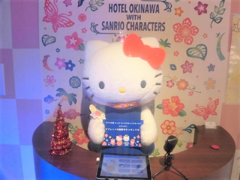 入口ではキティちゃんが出迎えてくれますし、ぬいぐるみがたくさん集まったオブジェがロビーにあります。また、サンリオショップとカフェが併設されていて、ホテル内でも楽しく過ごすことができました。お部屋もサンリオキャラの部屋で、いちご新聞やサンリオキャラのお土産をたくさん戴けて、大満足でした。無料スマホや、コーヒーマシンもありましたし、冷蔵庫にはさんぴん茶とお水も入っていました。
