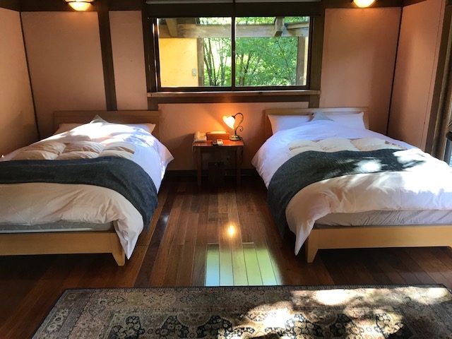 お部屋は三村の棟で和室、リビング、寝室、書斎の4つのお部屋に広いテラスと露天風呂付の贅沢な作りでした。。2人で泊ったのでもったいないほどでしたが、ゆっくりできました。ただ、ふと目に留まった隅々のほこりが気になりました。