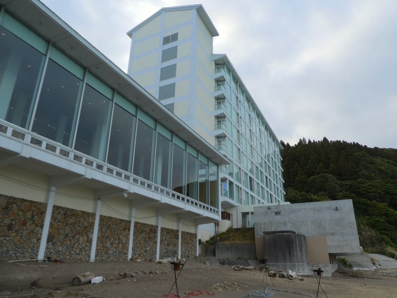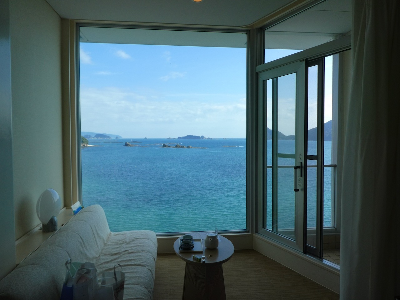 日南海岸を代表するリゾートホテル。南郷駅からバスがなく徒歩ではぎりぎり圏内か、という距離。山を越えて円弧状の山に囲まれた砂浜をひとりじめの素晴らしい立地。まるでプライベートビーチ。全室オーシャンビュー。それも天地いっぱい横幅いっぱいの大きな窓。小さなベランダもあります。